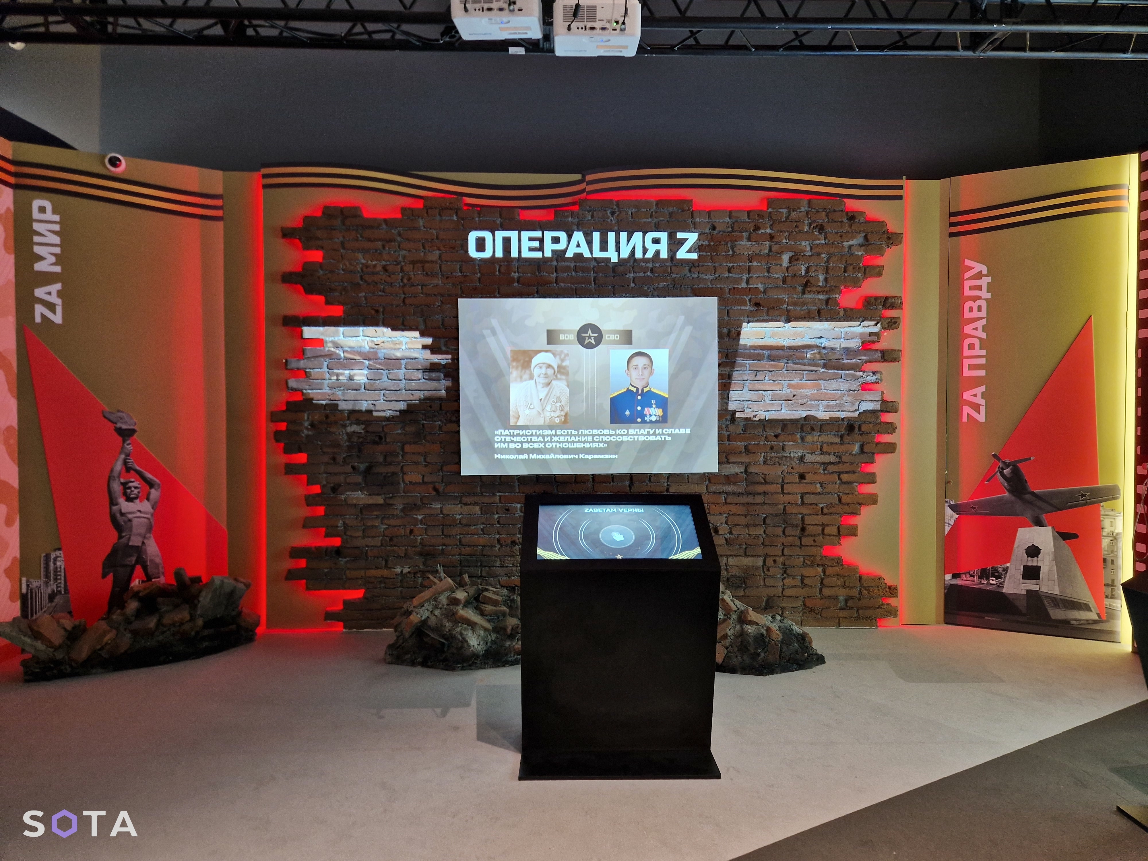 Напротив икон и Спаса Нерукотворного разместился стенд «Операция Z»: центральный (по мнению организаторов) раздел, где проводится «мощная параллель между героями Великой Отечественной и сегодняшними защитниками». На панели демонстрируют рандомные пары фотографий ветеранов ВОВ (в основном пожилых) и современных участников СВО. Правда, бойцов сороковых на мобилизационных пунктах встречал плакат «Родина-мать зовёт!», а нынешних — «Денежные выплаты от 5 200 000 ₽». Разве что по продолжительности нынешний конфликт потихоньку догоняет ВОВ и, возможно, обгонит её и затянется на долгие годы. «Война — это мир», как учит нас «Теория и практика олигархического коллективизма» Эммануэля Голдстейна. И Священной войной тут тоже не пахнет — подавляющее большинство украинцев не просто православные, а до недавнего времени ещё и одной с русскими поместной церкви. Конфликт же, где будет находиться церковное начальство — в Москве или в Киеве и Константинополе, носит скорее административно-финансовый характер и к вопросам собственно веры — догматическим и литургическим — отношения не имеет.