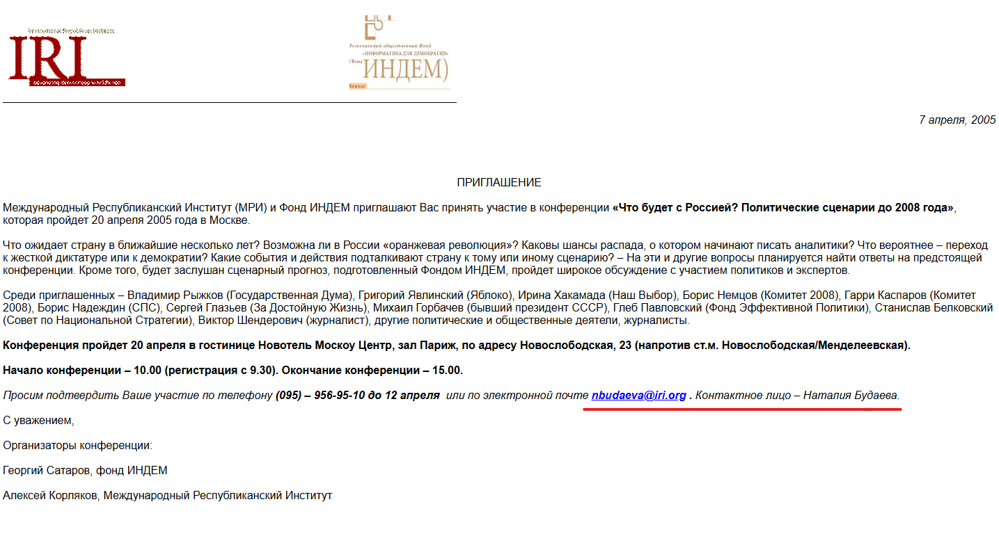 Должность у Арно на момент прихода в организацию очень небольшая (да и сотрудников в Москве можно пересчитать по пальцам) – что-то вроде секретаря. В интернете сохранился показательный документ: приглашение на конференцию «Что будет с Россией? Политические сценарии до 2008 года». Среди участников – Владимир Рыжков, Григорий Явлинский, Ирина Хакамада, Борис Немцов, Гарри Каспаров, Борис Надеждин, Сергей Глазьев, Станислав Белковский, Виктор Шендерович и уже покойные Михаил Горбачев и Глеб Павловский. В качестве контактного лица указана Наталия Будаева.