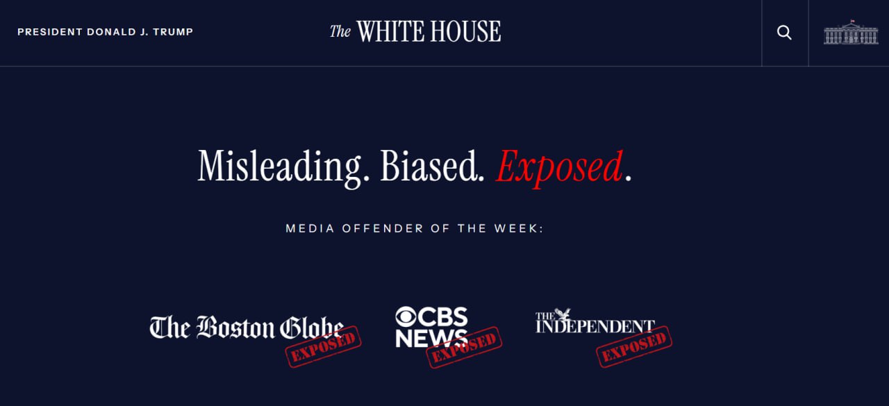 Раздел сайта «Зал позора» включает в себя издания The Washington Post, CNN, MSNBC и CBS News. Все они за последние месяцы выпустили большое количество критических материалов о деятельности Трампа и его кабинета.