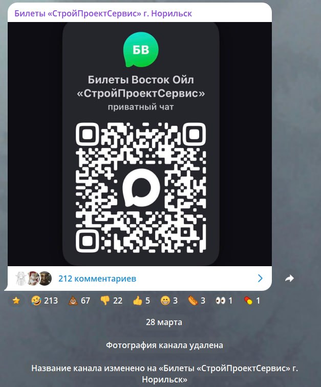 В итоге сейчас канал оказался переименован из «Билеты «Восток Ойл» в «Билеты «СтройПроектСервис» г. Норильск», его лого – «Восток Ойл» – было удалено, хотя упоминание проекта в описании канала осталось.