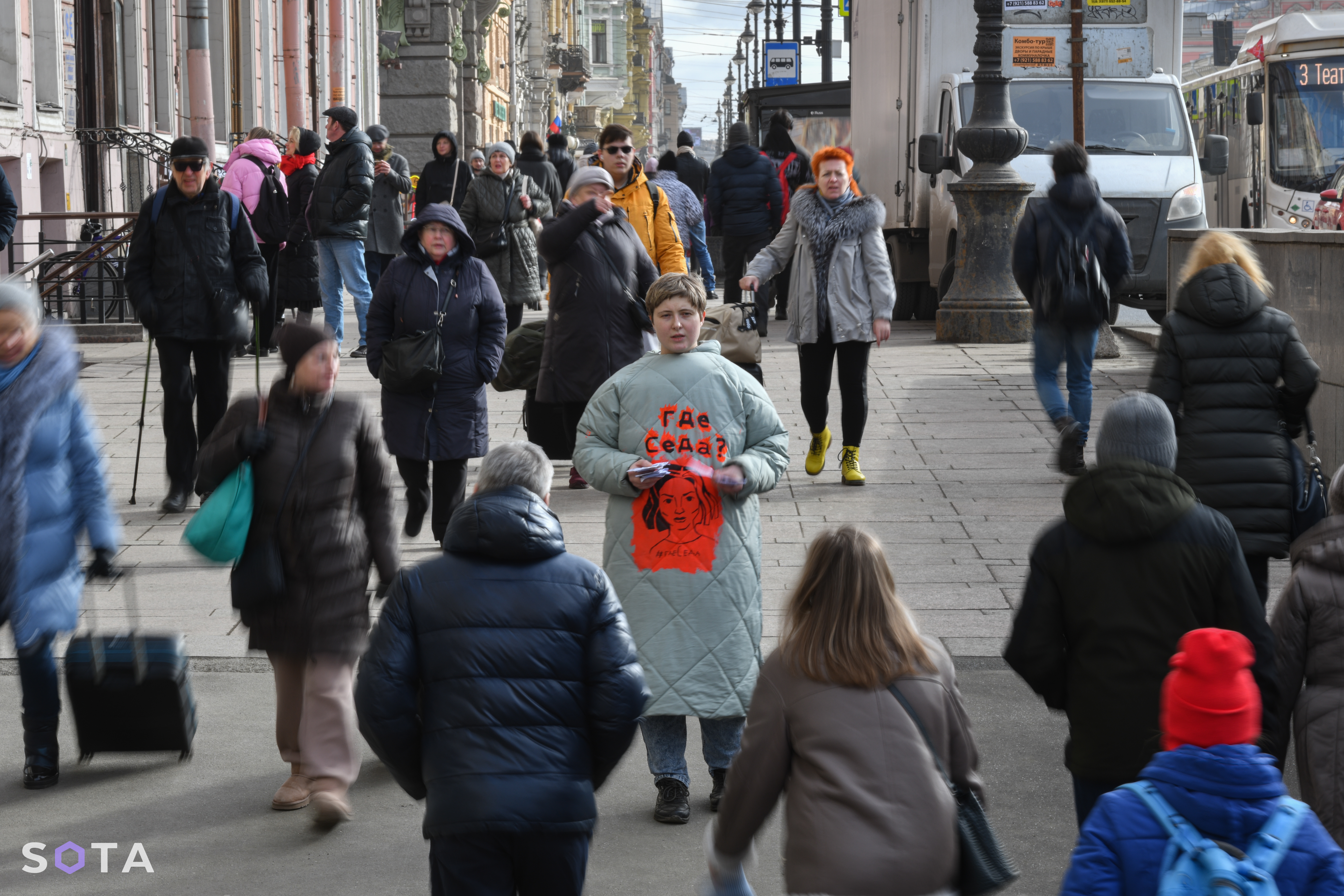 8 марта была первая незагребательная часть, я ходила по Невскому в красивой куртке и раздавала листовки, где не было ментов, и где у меня даже было чувство «доктор, меня игнорируют». Потом я пришла к прокуратуре, там какое-то время стояла.